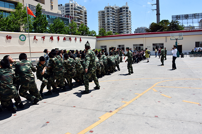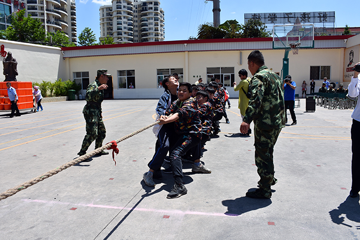交流并未因節(jié)目表演結(jié)束而落下帷幕,而是在兩校的拔河較量中迎來了高潮。各校分別派出了40名男生,經(jīng)過老師們的排兵布陣,兩隊都卯足了勁要贏了對方,大家齊心協(xié)力,把力量擰成一股繩,只見同學們有的手被勒得發(fā)紅,有的鼓著腮、瞪著眼,臉漲得像個紅蘋果......但為了勝利他們還是咬緊牙關(guān),一個勁兒地往后拉。由于實力相當,賽場上一時難分勝負。一旁的啦啦隊員比參賽者還起勁,有的扯開喉嚨拼命喊,有的張開手臂用力揮,有的恨不得上前幫一把......整個操場上的加油聲、歡笑聲此起彼伏,熱鬧非凡。經(jīng)過三個回合的較量,我校險勝。但兩校友誼第一、比賽第二和“一根繩、一條心”的精神給大家留下了深刻印象。