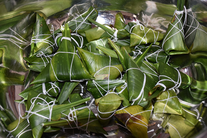 早點(diǎn)過后,師生們準(zhǔn)備好了所有材料,同學(xué)們在老師的指導(dǎo)下,清洗粽葉,準(zhǔn)備包粽子。不一會兒,所有材料準(zhǔn)備就緒,大家就開始包起粽子。細(xì)長的粽葉在師生們靈活的手指下團(tuán)成漏斗狀,糯米合著花生、火腿被包進(jìn)粽葉中,一根根細(xì)彩線纏繞在粽子上。折粽葉、填糯米、裹葉子、系線,一時(shí)間粽葉飛舞,絲線穿梭,一個(gè)個(gè)玲瓏而秀氣的粽子不一會兒便誕生了,在這過程中,大家還交換了如何把粽子包的更漂亮、更有型的心得。大家一邊包粽子,一邊分享著端午這一傳統(tǒng)節(jié)日的故事;顒蝇F(xiàn)場一片歡騰,笑聲連連,整個(gè)餐廳沉浸在一片歡樂的海洋里。