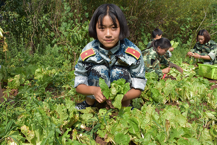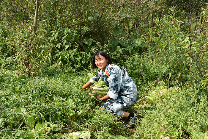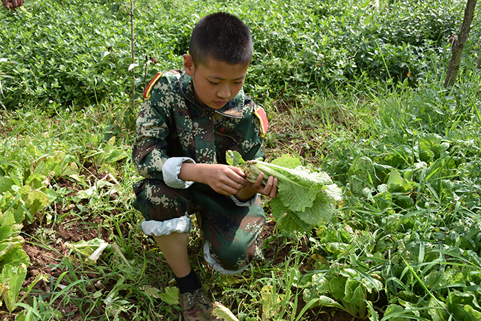 旁邊摘菜的同學(xué)也不甘示弱。他們小心翼翼地把小白菜連根拔起,細心地把根上的泥土和蔫了的部分去掉。不一會兒,也采摘到了滿滿兩大筐。