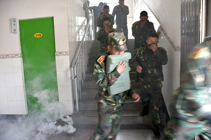 隨著毛副校長“防震減災(zāi)應(yīng)急疏散演練開始”的一聲令下,“地震警報(bào)”信號立即響起,學(xué)校迅速啟動避震應(yīng)急機(jī)制,學(xué)生們在各班老師的組織下,迅速抱頭,有序地聽從樓層負(fù)責(zé)人指揮,按指定路線“逃生”,疏散到安全區(qū)域。避震演練結(jié)束,校園內(nèi)火警模擬信號又隨即響起,學(xué)校消防疏散應(yīng)急機(jī)制迅速啟動。學(xué)生們用枕頭、帽子或手袖捂住口鼻,彎著腰迅速撤離到安全區(qū)域。