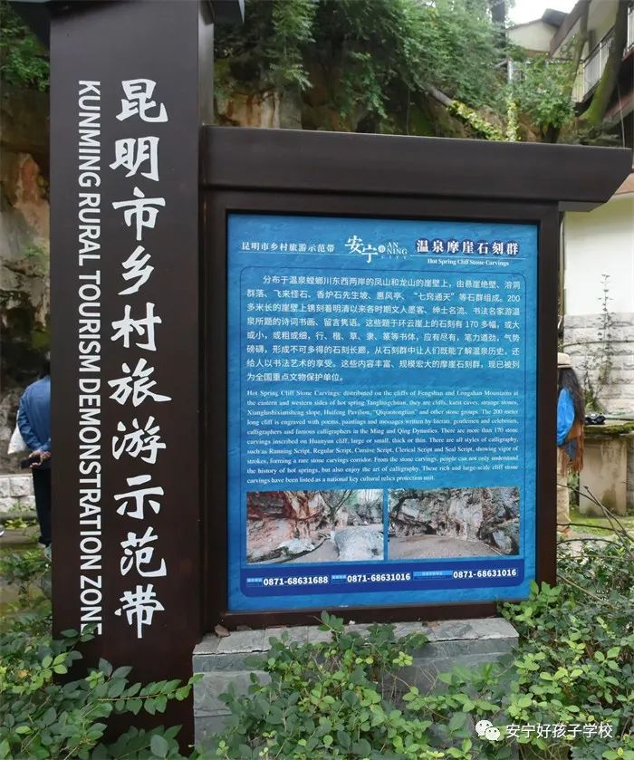 不知不覺間來到了溫泉小鎮(zhèn)摩崖石刻群,上面匯集著從明代至民國年間云南和全國詩書畫名師大家游覽溫泉留下的題詞、詩歌、碑銘、壁畫和書法集錦。古韻十足的摩崖石刻,引得同學(xué)們駐足觀看,在驚嘆大自然鬼斧神工的同時,也不忘仔細(xì)揣摩石崖上鐫刻著的詩詞書畫,觀之既能讓人了解溫泉?dú)v史,又給人以藝術(shù)美的享受。
